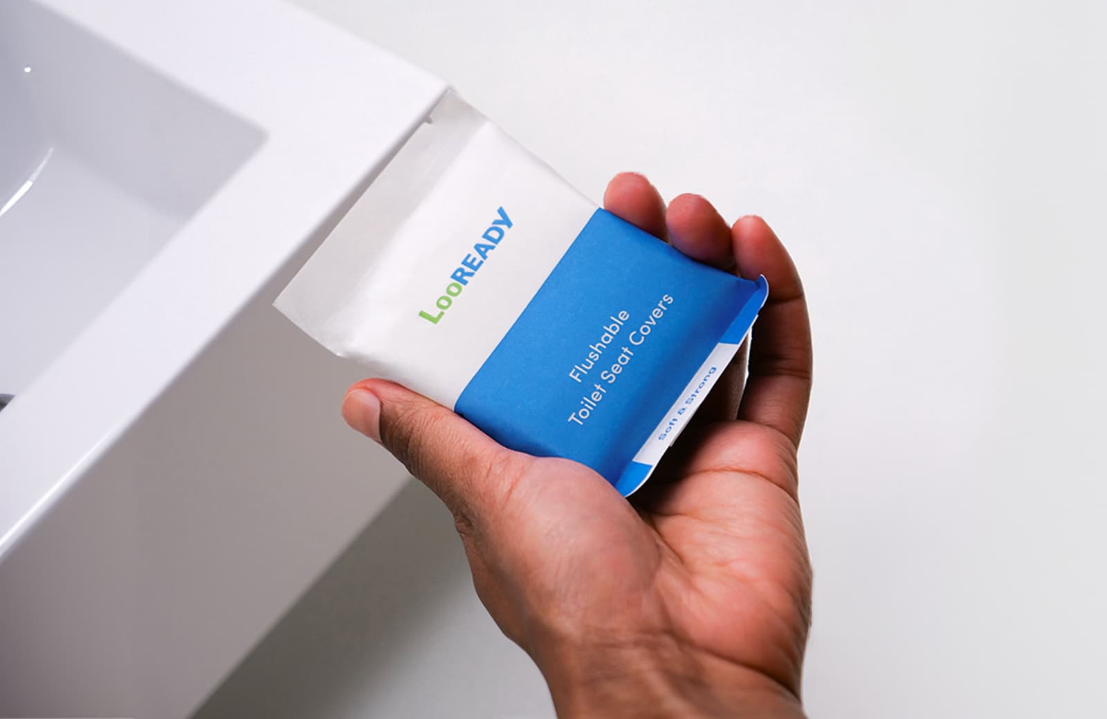 The material that forms LooREADY Toilet Seat Covers is made from a proprietary ecopolymer film created with water soluble, biodegradable non-toxic components including: fatty acids, glycerol, PVOH polymers, plus several other ingredients kept secret by our LooREADY scientists. The ecopolymer film is sandwiched between a super thin layer of organic wood pulp which breaks apart in sanitation systems and our ecoploymers dissolve when flushed.